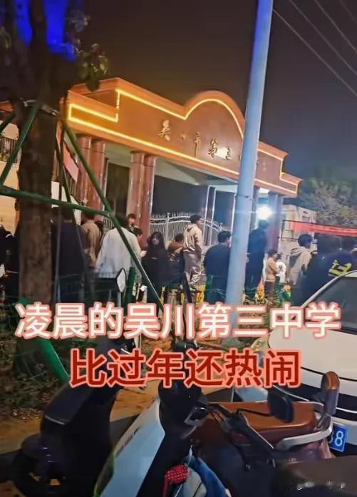 凌晨的吴川第三中学校门口人潮涌动,热闹程度堪比过年。